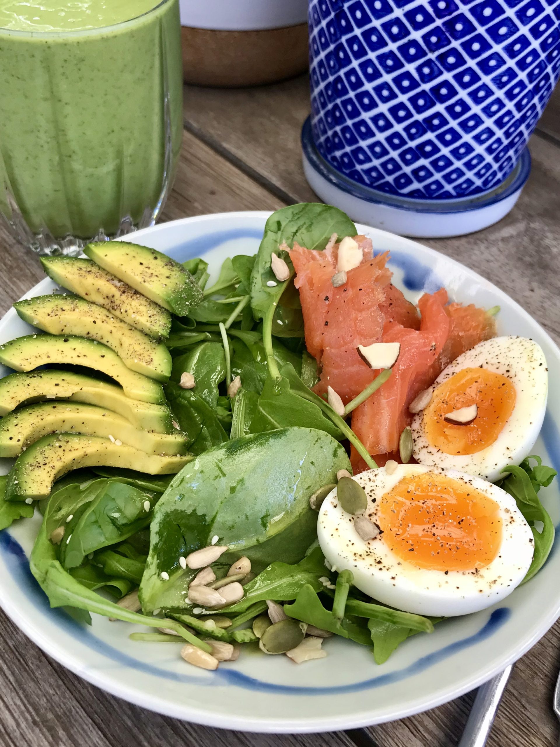 Boil or scramble eggs, however you prefer them. Serve with spinach, salmon & avo!